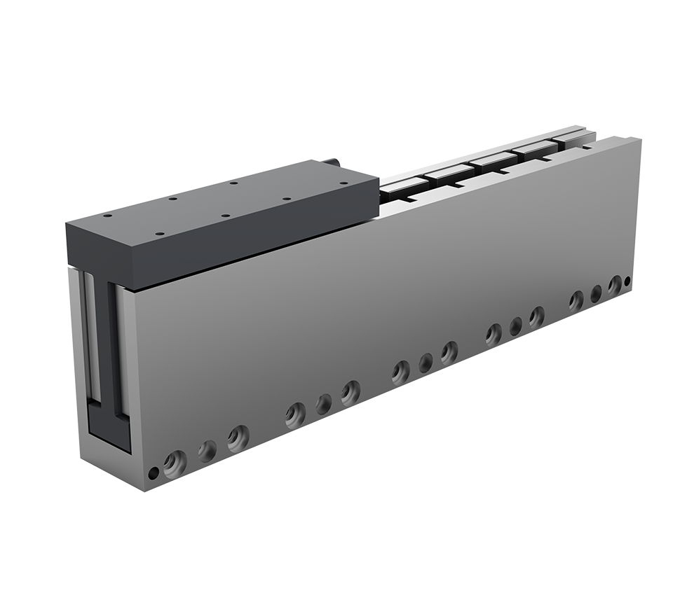 無鐵芯直線電機由線圈組成的電機動子和永磁體的定子組成,由于動子沒有鐵芯,因此其重量輕,動子和定子之間沒有磁吸力,沒有齒槽效應,可以實現很高的加速度和運行平穩性;動子和定子之間為非接觸式,不存在機械傳動限制,因此具有高系統動態性能、平穩的運行速度和高定位精度、無磨損或免維護、超長行程等優點。
